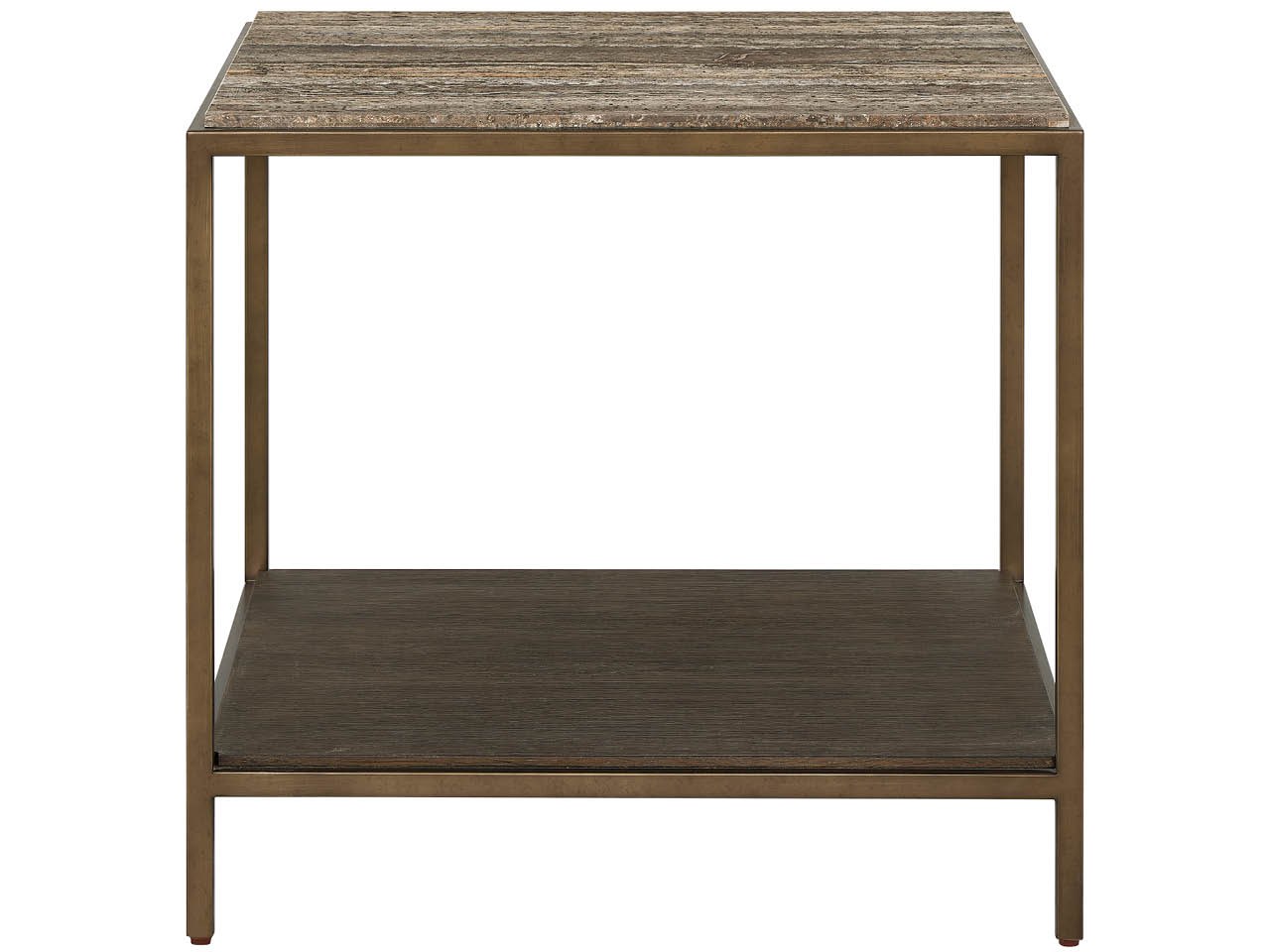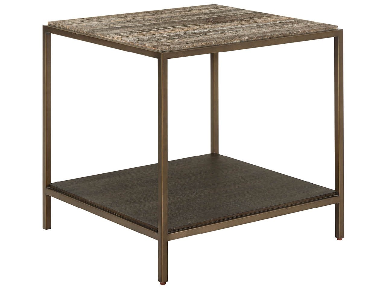 The Brindle End Table mirrors premium material sophistication with a Dark Gray Travertine top and a Cocoa wood shelf. The geometric Smoked Gold metal frame maintains visual consistency while providing elegant accent surfaces throughout the home.