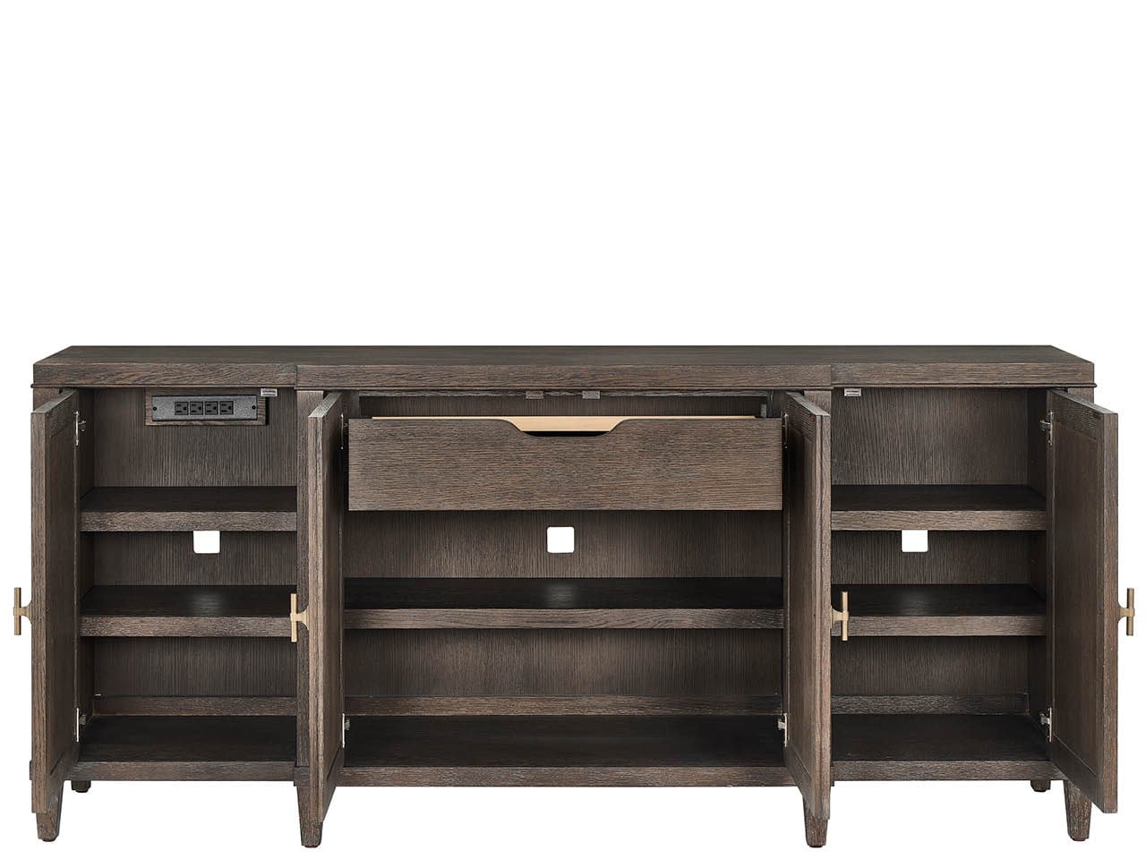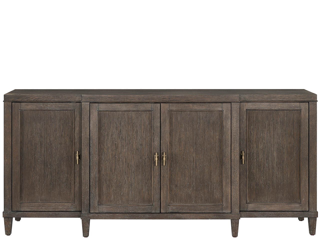 Montclair Cocoa Credenza (U508679)The Cocoa Credenza offers exceptional dining room storage with reeded door fronts that add textural dimension to clean aesthetic lines. This substantial piece features a felt-lined silverware tray, adjustable shelving, and integrated wire management with a power supply bar for modern functionality.MontclairCredenzas And ChestsDining RoomU508679