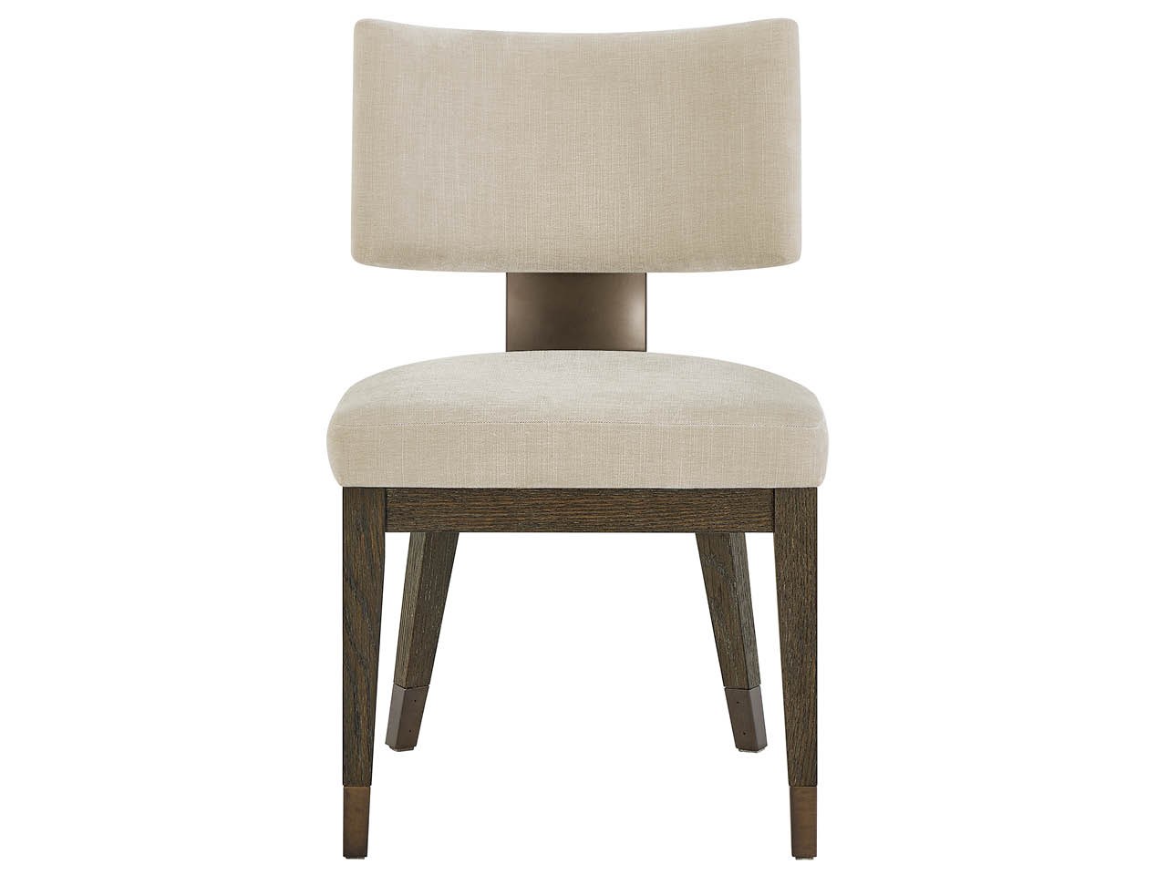 The Cocoa Side Chair features classical Klismos-inspired design with splayed legs and Smoked Gold metal ferrules. Upholstered back and seat in soft Silken Fog fabric create comfortable dining seating that works beautifully with coordinating tables.