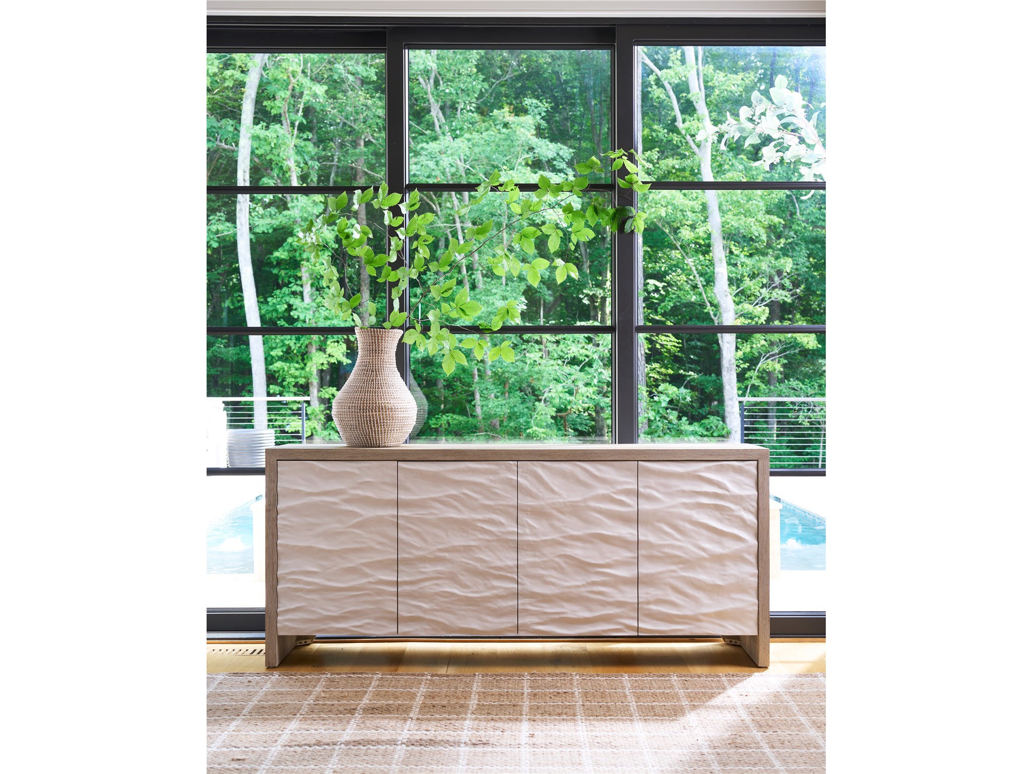 Oasis- Coastal Living Home Collection Oasis Credenza (U533967)The Oasis Credenza combines a Dockside oak case with white wave-patterned door fronts that reference the movement of water. This 78-inch credenza with 34-inch height, felt-lined silverware tray, and ample adjustable shelving with wire management makes it perfect for dining or media storage in your coastal-inspired home.Oasis- Coastal Living Home CollectionCredenzas And ChestsLiving RoomU533967